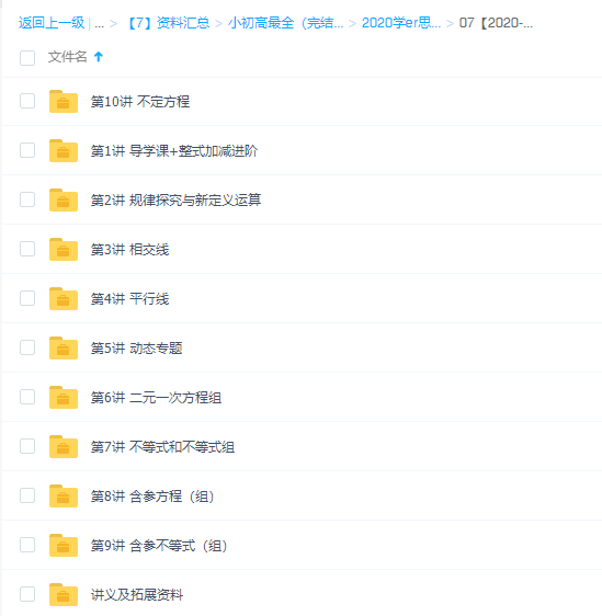 此课件来自学而思网校,小升初学而思2020-秋初一数学直播目标班全国版(朱韬)。此课件主要知识点包括:导学课+整式加减进阶、规律探究与新定义运算、相交线、平行线、动态专题、二元一次方程组、不等式和不等式组、含参方程(组)、含参不等式(组)、不定方程。