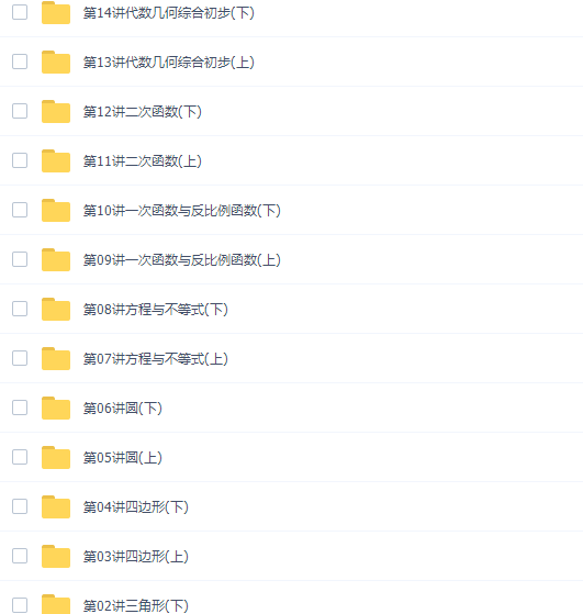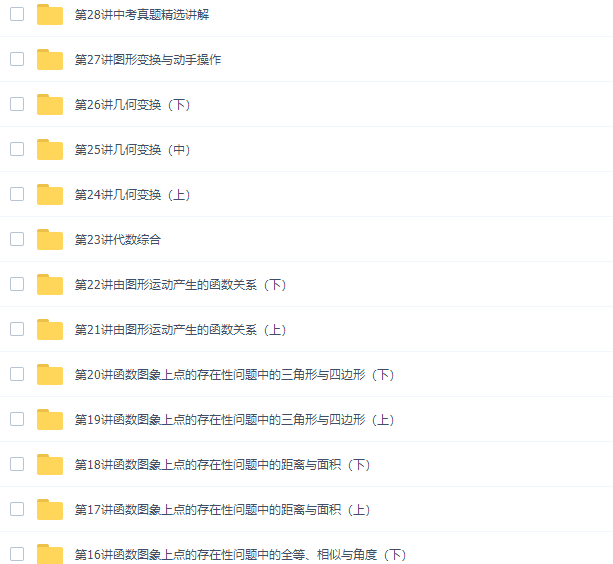 此课件来自中考数学徐杰中考数学一、二轮复习联报班完结,此课件主要知识点包括:三角形、四边形、圆、方程与不等式、一次函数与反比例函数、二次函数、代数几何综合初步、代数综合、几何变换、图形变换、中考真题精选讲解。
