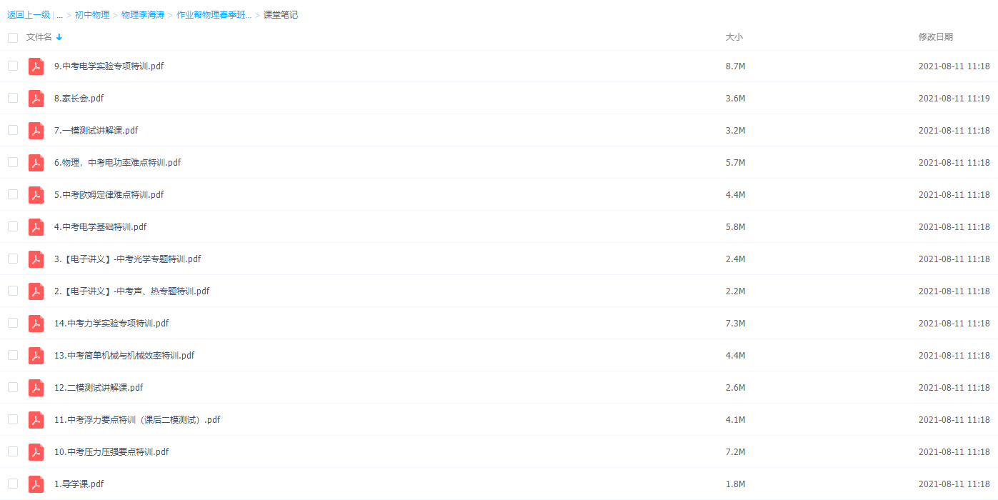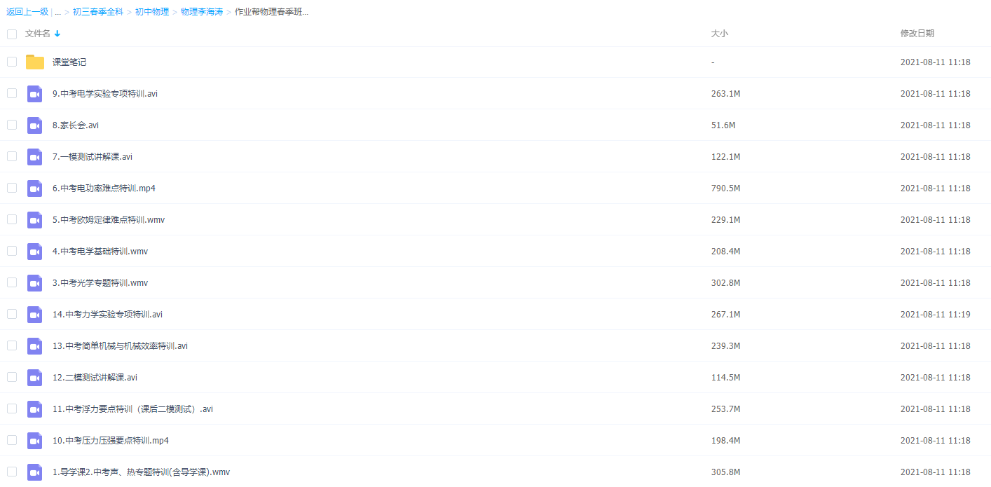 此课件来自作业帮网校,作业帮-中考物理春季班李海涛,包含视频课程和讲义资料。此课件主要内容包括:中考声、热专题特训、中考浮力要点特训、中考力学实验专项特训、—模测试讲解课和中考欧姆定律难点特训等等视频