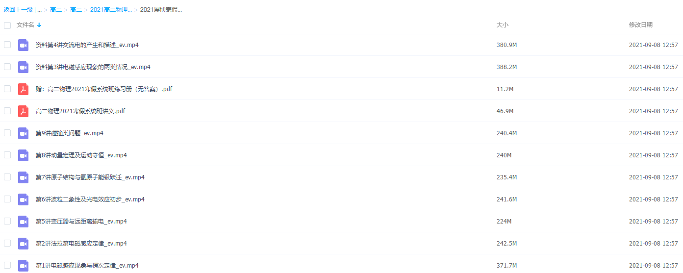 此课件来自于高途课堂,2021年寒假高二张展博视频课程,包括课程视频回放以及讲义资料。课程知识点包括电磁感应现象与楞次定律、法拉第电磁感应定律、电磁感应现象的两关情况、交流电的产生和描述、变压器与远距急辅电、波粒二象性及光电效应初步、原子结构与氢原子能级跃迁、动虽定理及运动守恒_和碰撞类问题等视频,还赠送了高二物理2021寒假系统班讲义。